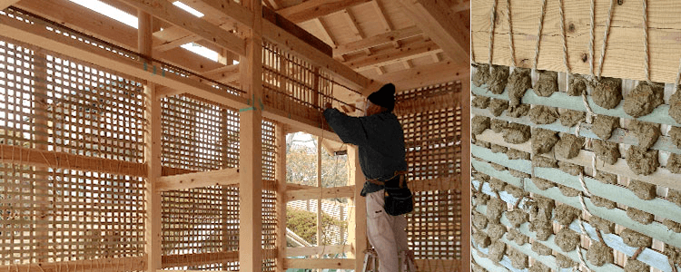 木組の柱と貫の間に竹で小舞を編み、左官が、身近な材料である土で壁を作ります。