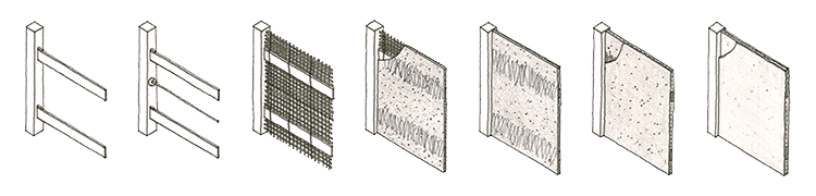 およそこのような工程をたどって、何重にも土をつけたり塗ったりします。壁の厚みの中に、木と竹と土とが、みっちりと詰まっています。