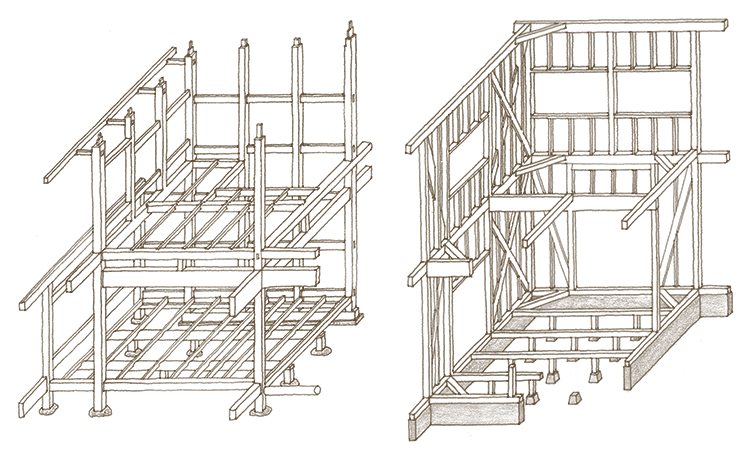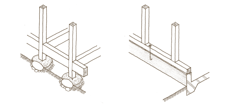 左:石場建て。礎石の上に柱が固定されずに載っている。柱同士は足元の低い位置で足固めでつながる。